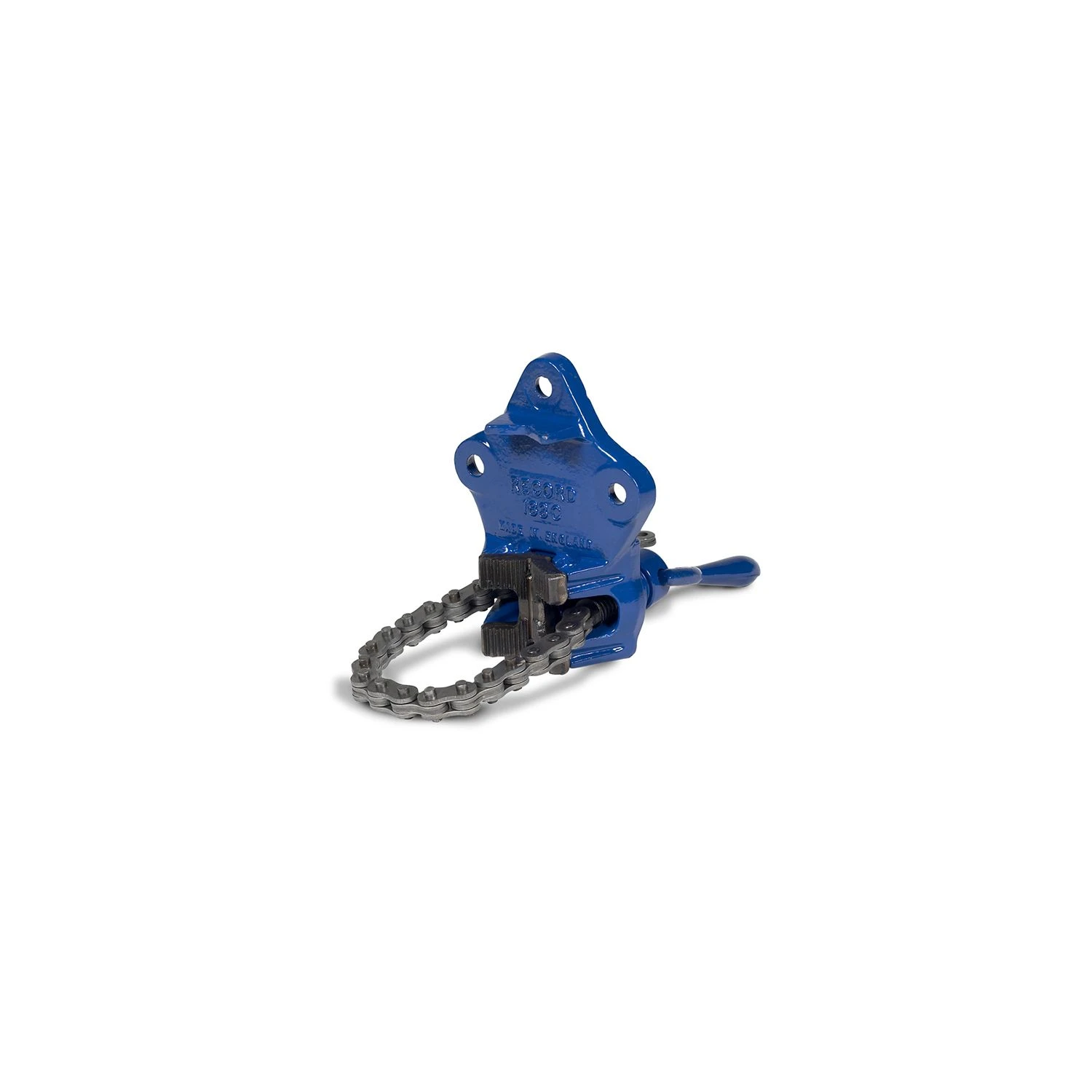 IRWIN Record Chain Pipe Vice rests on a V formed by two sets of drop-forged, heat-treated replaceable steel jaws.